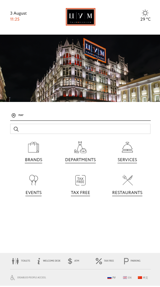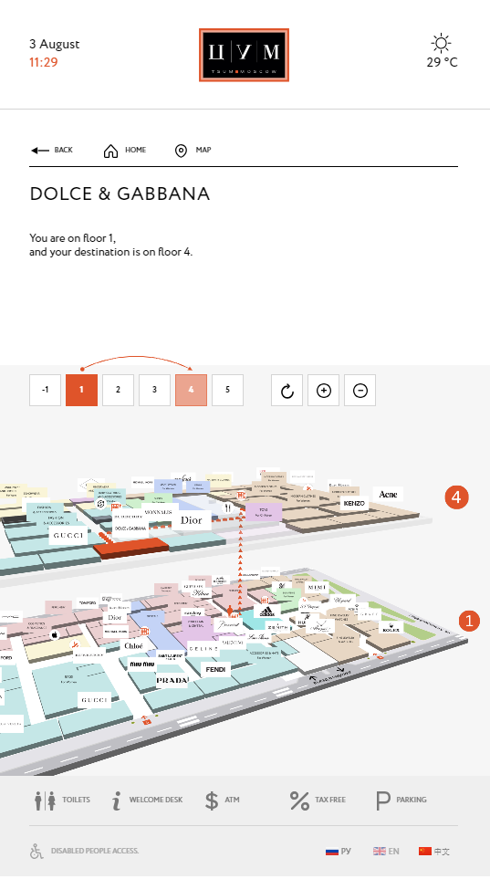 21 Lémuriens kiosks have then been deployed over the 5 floors of TSUM Moscow which guide towards more than 800 brands through 2500 sales locations, and 14 Lémuriens kiosks over the 5 floors of DLT St Petersburg which guide towards more than 600 brands spread over 1700 sales locations.