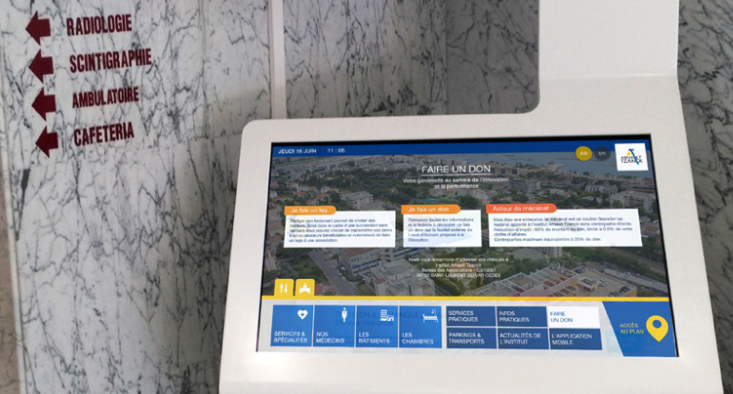 Les visiteurs peuvent aussi consulter des informations sur votre hôpital ou clinique. Les produits ViaDirect peuvent se synchroniser avec d’autres plateformes et d’autres systèmes de gestion de contenus, ce qui permet différentes intégrations comme : l’affichage de données en temps-réel, des informations sur la météo, des annonces publiques ou des mesures de sécurité, les horaires des transports en commun proches, des offres commerciales, des systèmes de comptage de personnes ou encore des systèmes de gestion de file d’attente.