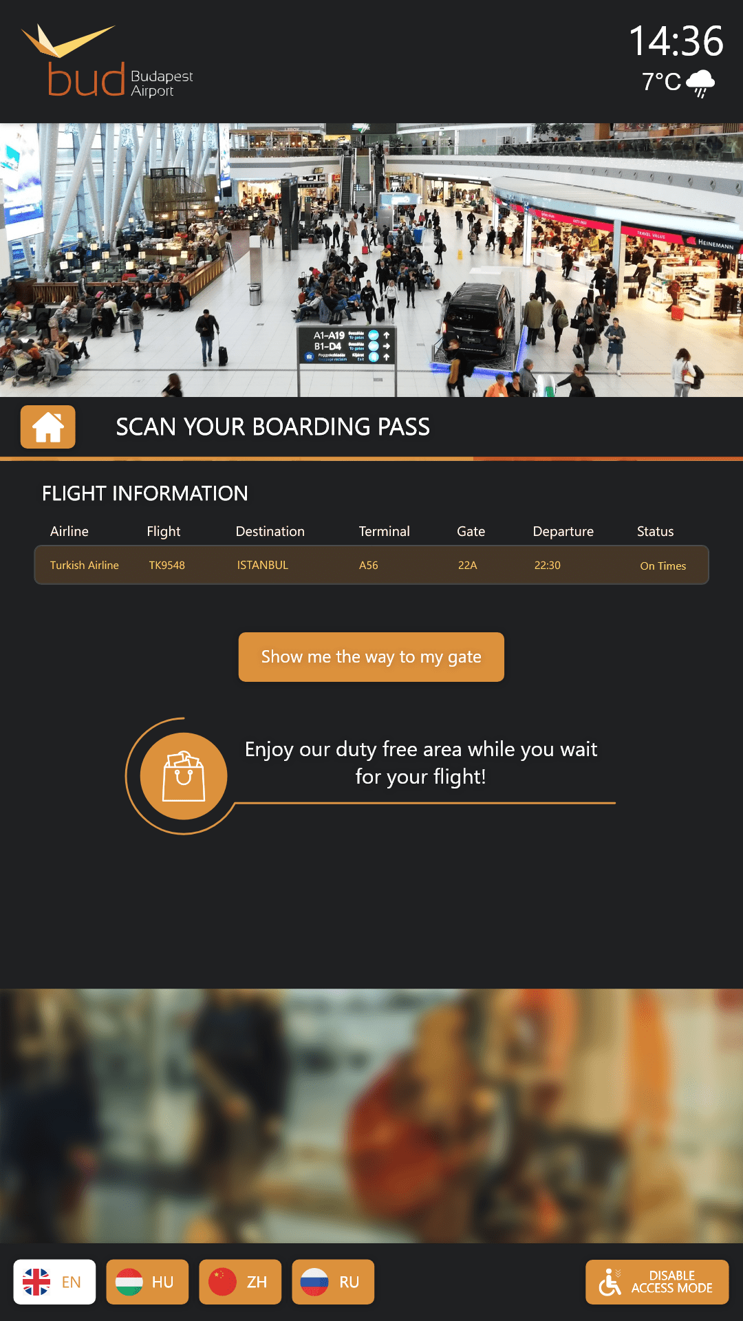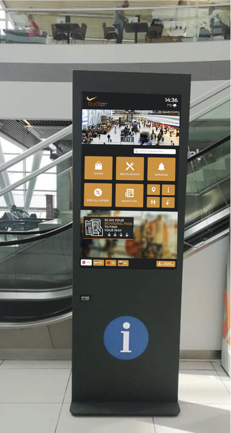 Le et d’information developed by ViaDirect enables the display of essential information such as boarding gates, departures, and arrivals. All shops, services, and restaurants are displayed as destinations on the plan en 3D of the airport. In addition, the kiosks include a QR Code reader to scan boarding passes and show passengers all the information they need to arrive at their gate. The et d’information interface has been custom-developed for the airport, in Hungarian and English.