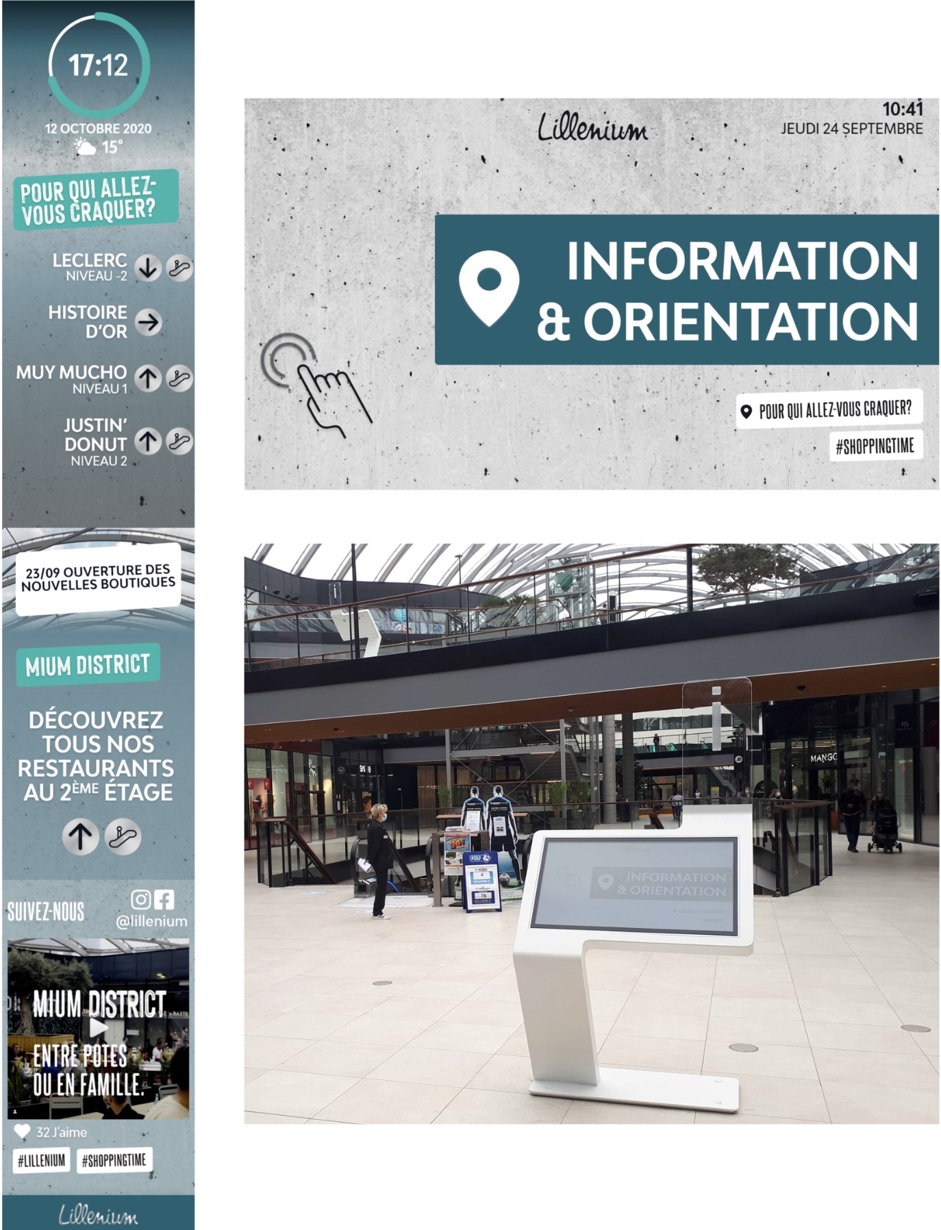 The content of these special kiosks is adapted according to the time of day, in order to provide a relevant offer. For example, they will indicate the restaurants in priority at noon or the supermarkets and the mall’s services in the morning. Dynamic content such as the center’s Instagram feed or the weather forecast has also been added to these kiosks. This content is also managed with the Media4Display software from Telelogos sur lequel ViaDirect est certifié.