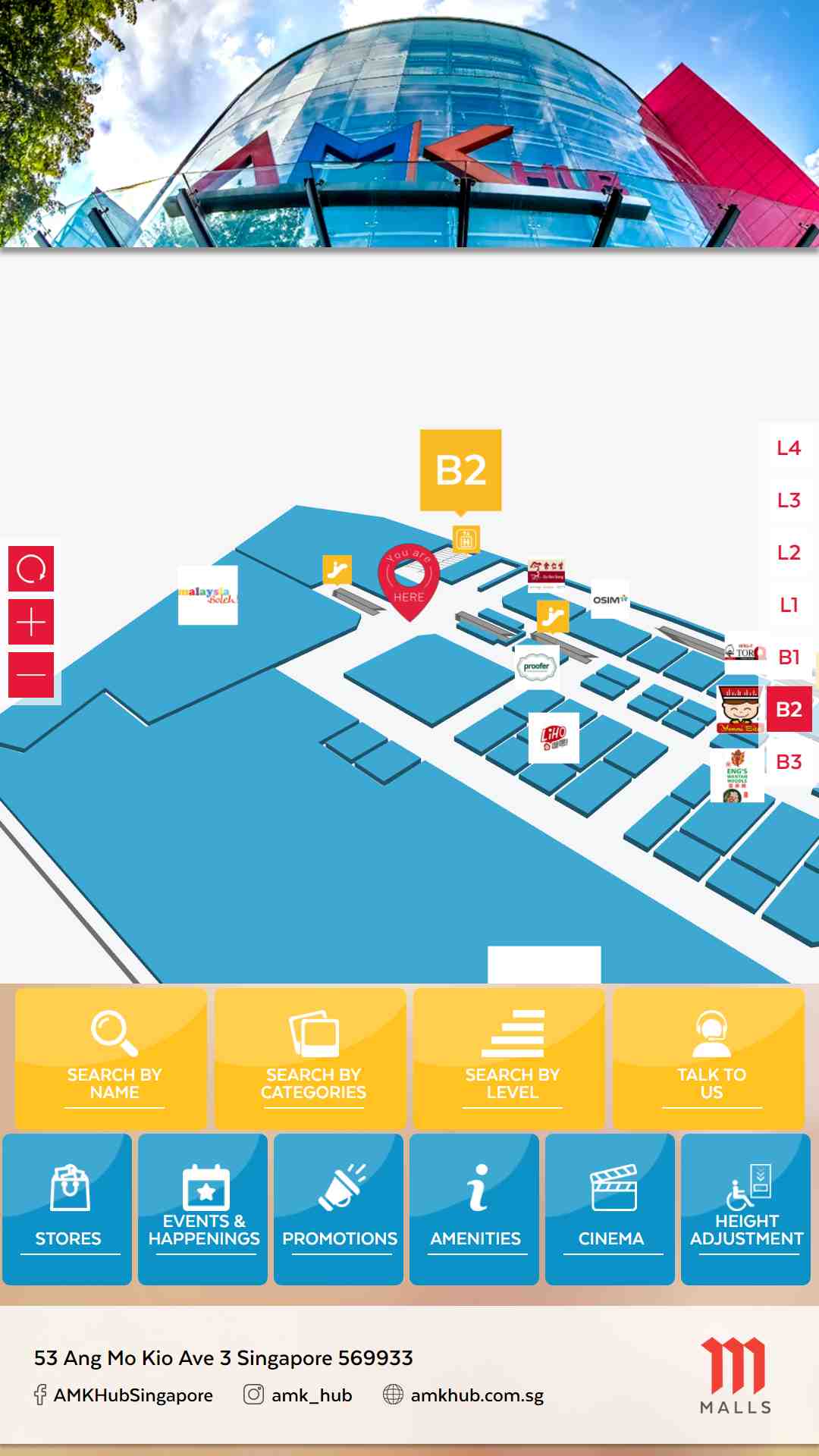 Ouvert depuis 2007, l’AMK Hub abrite environ 200 boutiques et restaurants sur ses 48 000 m2 de surface commerciale répartis sur 4 étages et 3 sous-sols, dont un dédié au parking.