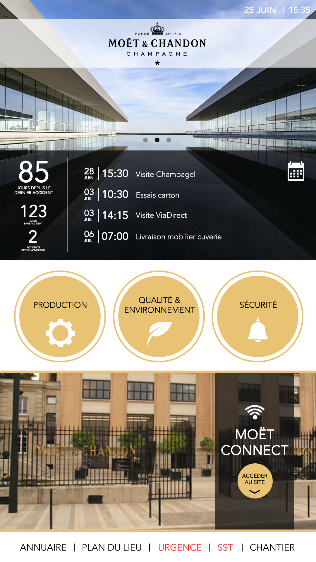 Embedded Le logiciel ViaDirect offers to Moët & Chandon collaborators a range of interactive professional and secured information such as… directory, location map, specialized job sheets, health and security bulletins, production monitoring… All in a graphically prestigious designed user interface on par with the renowned place and brand.