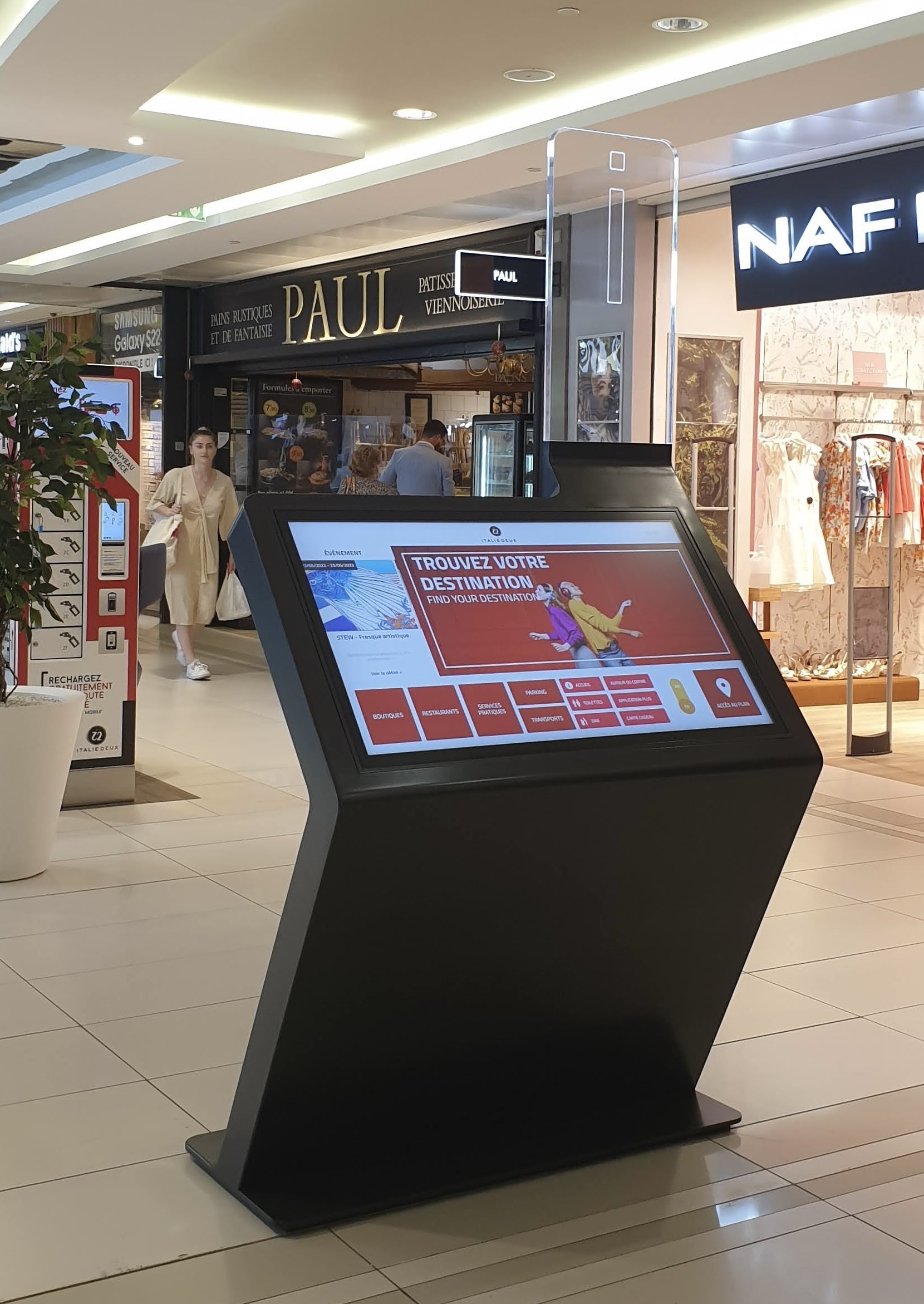 The shopping center Italie Deux benefits from a real help for its visitors in order to guarantee a good customer satisfaction. If you would like to benefit from our innovant de bornes d’orientation, prenons rendez-vous : Contact.