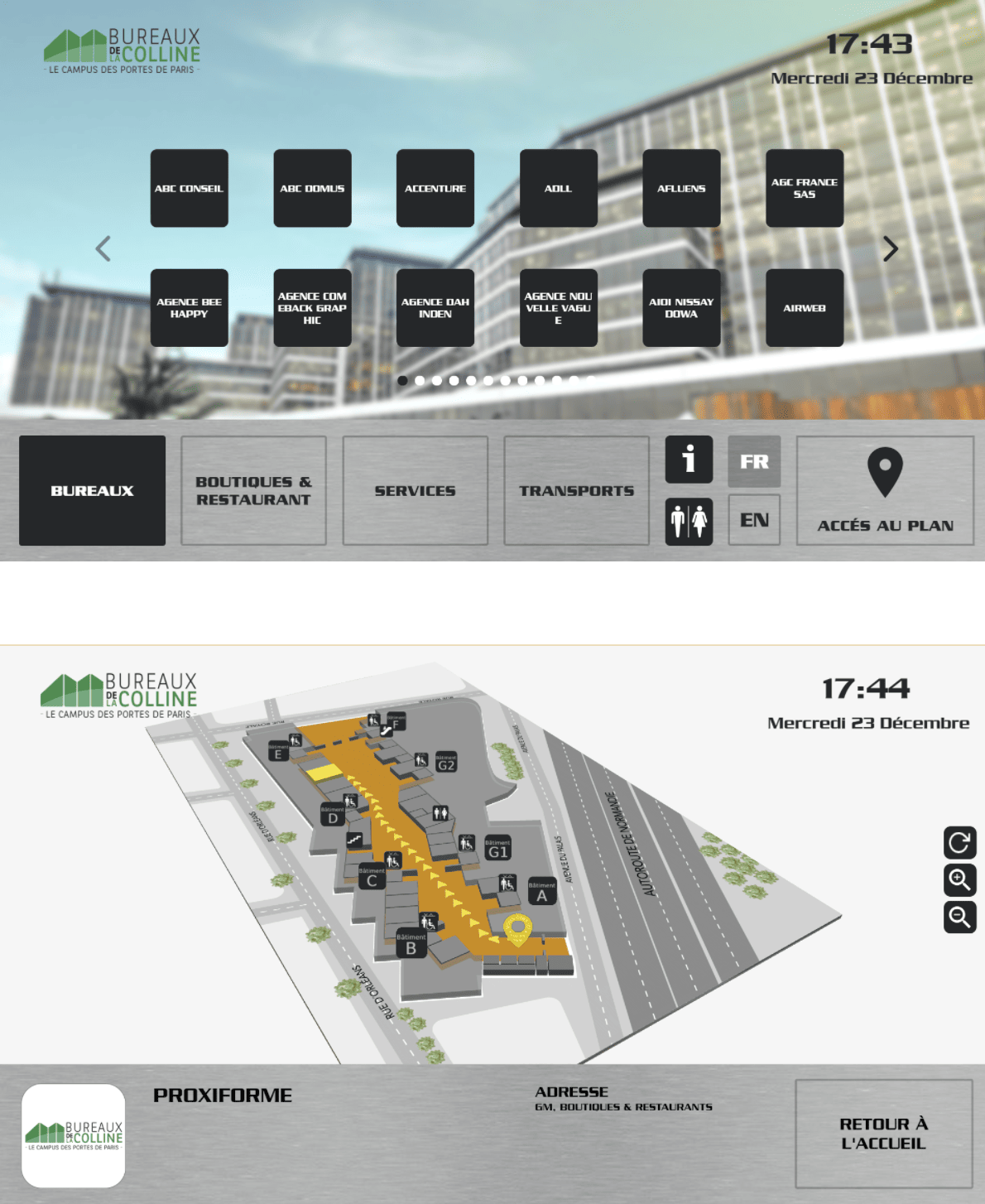 In order to facilitate orientation in this complex, Real Estate Bnp Paribas, the property owner, has worked with ViaDirect to set up digital wayfinding kiosks.